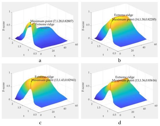 The road markings extracted manually are compared with those extracted automatically in Section 4.3 pixel by pixel, and a different F-score is calculated when the parameters and the parameter are different values in respective sections of road. The parameters that maximize the F-score are the optimum parameters that are searched for, as described in Section 4.3. The method of calculating the F-score values is described in Section 3.2. We traverse different values of the parameter in the interval [5, 50] with sub-interval 1, and we also traverse different values of the parameter in the interval [0.5, 1.8] with sub-interval 0.01, aiming to determine the parameter F-score under the condition of different values of the parameters and .