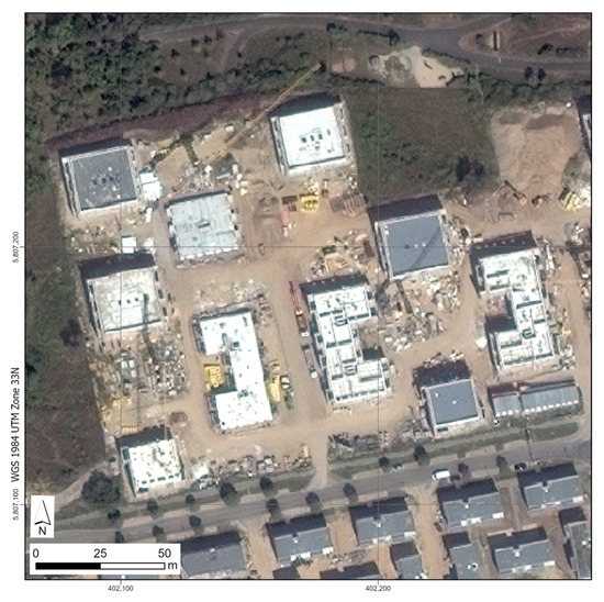 In a case study [], an area from the southern part of the German capital Berlin was selected to test the suitability of VHR earth observation data for the identification and quantification of construction activities. It appeared suitable due to the high level of construction activity during the past years. Images of a time period between 2015 and 2020 were used to determine the reliability of the new robust extraction workflow to be developed. The determination of new construction areas turns out to be especially difficult, since one can hardly recognize the development of a building before its completion.