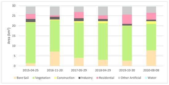 For the mono-temporal classification pattern approach, eight examples of the following types are compared: Residential areas, industrial areas, and construction sites (Figure 4). The aim is to discriminate those types by their class composition. The class compositions reveal that construction areas appear significantly different from residential or industrial areas. However, it is not possible to work out distinct discrimination between different types of construction sites. In Figure 5, one can see the result for the 29 April 2018.