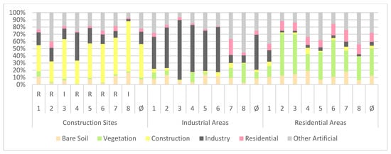 Construction sites are characterized by a composition of approximately 47% construction and approximately 43% sealed surfaces with a slight tendency towards industry and other artificial surfaces. It is impossible to identify significant differences between construction sites for residential (R) or industrial buildings (I). That is because of the similar material appearance of construction sites. It is hardly possible to recognize the envisaged use of buildings.
