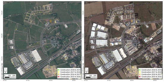 Multi-temporal classification results of Type B, displayed on two WorldView scenes (24 May 2015 (left) and 8 August 2020 (right). One can identify areas that were under construction in two years. Data source: WorldView Image ©2021, DigitalGlobe Inc., a Maxar company [].