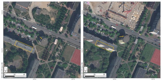 Comparison of the WorldView-3 scenes from the 24 May 2015 (left) and the 29 April 2018 (right) to illustrate the radial offset (arrows) with the associated vertical tilt of buildings (facades become visible) and the resulting occlusion of surfaces (exemplified by a base rectangle for reference). Data source: WorldView Image ©2021, DigitalGlobe Inc., a Maxar company [].
