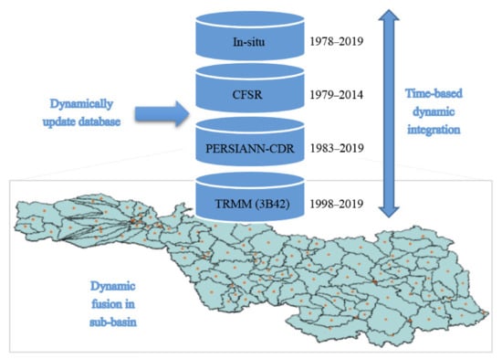 Note that this is a dynamic fusing process. is not a fixed value, and it is varying in the sub-basins. Furthermore, the database can be updated, and FMSPP dynamically fuses all available in-situ and satellite datasets over the time span (Figure 4).