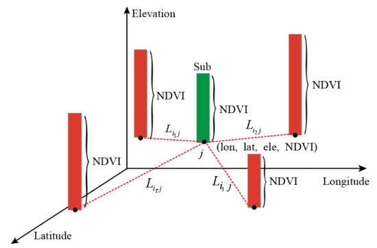 Precipitation is not only influenced by spatial location but also significantly correlates with elevation and NDVI [34]. Vegetation coverage in the continental area of China reflects the distribution of annual precipitation. The positive relationship between precipitation and NDVI was indicated in the Refs. [35,36]. A quantitative analysis about how NDVI responds to precipitation was made in Yellow-Huai-Hai River Basin [37], and it was concluded that 10% of increased precipitation would obtain 3.35–4.80% increase in NDVI. These findings indicate that increased precipitation is critical for the growth of most of the vegetation types. Herein, we take these four variables into consideration and propose the MIDSM to optimize selecting precipitation points for sub-basins. The precipitation point with the smallest generalized distance or the most significant similarity between the precipitation data points and the geometric center is selected as the precipitation source for the sub-basin. Figure 5 shows a schematic of the MIDSM, and the specific steps to apply this method are as follows.