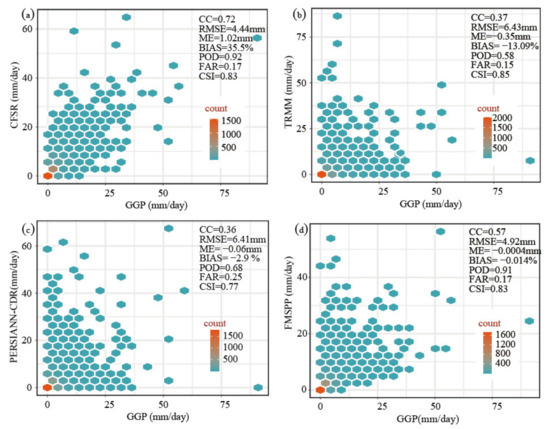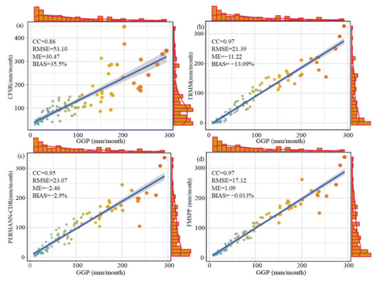 Statistical analysis of SPPs and FMSPP against GGP on a monthly scale over the whole watershed: (a) CFSR, (b) TRMM, (c) PERISANN-CDR, and (d) FMSPP (the change in the color of the dots from cyan to red represents the change in the magnitude of the rainfall from small to large).