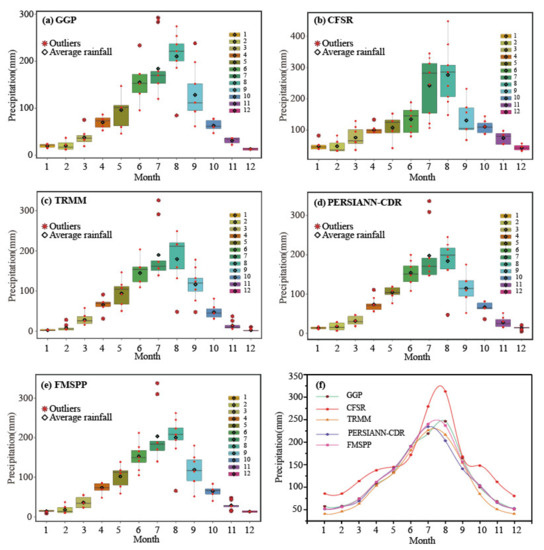 Average monthly rainfall distribution of the five precipitation products during 2000–2008 over the whole watershed: (a) GGP, (b) CFSR, (c) TRMM, (d) PERSIANN-CDR, and (e) FMSPP. (f) Compares the average of the five precipitation products.