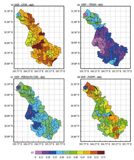 Spatial distribution of correlation coefficients for SPPs and FMSPP on a daily scale from 2000 to 2008: (a) CFSR, (b) TRMM, (c) PERISANN-CDR, and (d) FMSPP.