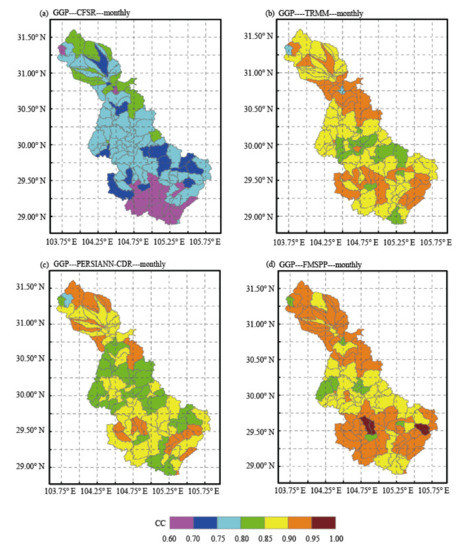 - FMSPP shows the maximum POD and minimum CSI, which proves that FMSPP can capture the occurrence of rainfall events very well. What is more, the absolute values of ME and BIAS for FMSPP are the smallest both on the daily and monthly scales over the watershed. Besides, the CC is significantly higher in most sub-basins on the monthly scale for FMSPP than the other three SPPs. Its CC changes in the range of 0.84–0.96. These results demonstrate that the performance of FMSPP is the best compared with the original SPPs.
