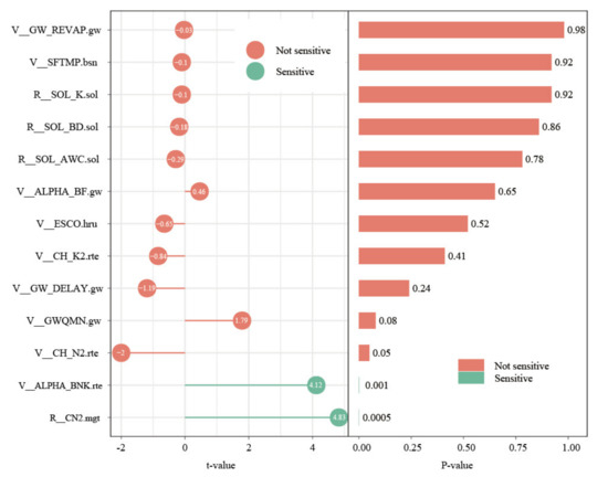 Based on the Sequential Uncertainty Fitting (SUFI) algorithm embedded in the SWAT Calibration Uncertainty Programs (SWAT-CUP), the Latin hypercube method [42] was utilized to sample each parameter value within a specific range, and NS was used as the objective function to find the optimal parameter set. Table 7 shows the range of each parameter [43], the optimal parameter set, and the global sensitivity analysis results. The t-value was employed to identify the significance of the parameter, and the p-value determined whether to reject the null hypothesis (a rejection of the hypothesis meant that the parameter had a significant impact on the objective function value). The global sensitivity analysis was relative to one-at-a-time sensitivity analysis, and it signified the alteration of the objective function value resulting from a parameter change. The more the objective function value changed, the more sensitive the objective function was to the parameter, corresponding to a higher t-value and a lower p-value. As shown in Figure 13 and Table 7, the most sensitive parameter was the initial SCS runoff curve for moisture condition Ⅱ (CN2), then base flow alpha-factor (ALPHA_BNK), followed by manning’s n value for the main channel (CH_N2). For the meaning of other parameters involved in the figure and table, please refer to [44].