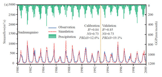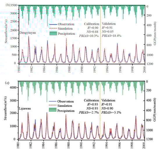 Monthly streamflow measured at the three hydrological stations and the simulation result from GGP from 1980 to 1999 (1980–1992 for calibration and 1993–1999 for validation): (a) Sanhuangmiao, (b) Dengyinyan, and (c) Lijiawan.