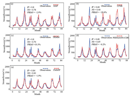 Comparison of the monthly runoff between the observations and those simulated with the five precipitation products at Lijiawan hydrological station from 2000 to 2004 (Months 1–60) and 2007 to 2008 (Months 61–84): (a) GGP, (b) CFSR, (c) TRMM, (d)PERSIANN-CDR, and (e) FMSPP.