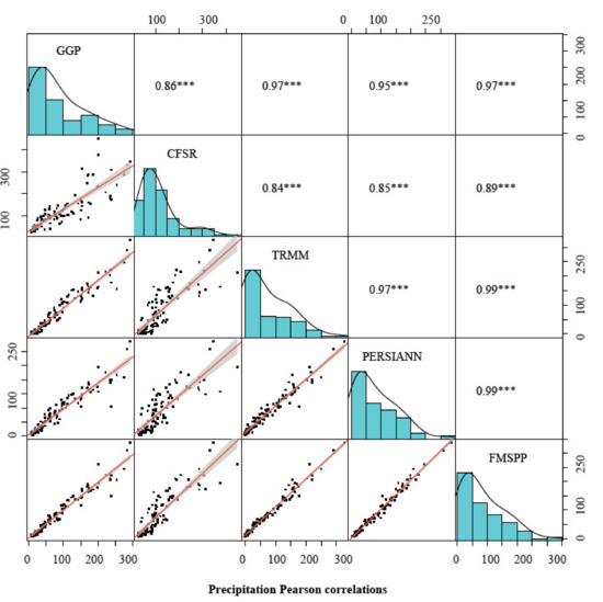 Figure 16 shows the probability density distribution of the monthly precipitation of the five precipitation products. Besides, the correlations and their confidence intervals between any two precipitation products are displayed in the figure. CFSR is less correlated with the other four precipitation products. Its Pearson CC with GGP, TRMM, PERSIANN-CDR, and FMSPP is 0.86, 0.84, 0.85, and 0.89, respectively. The CC for FMSPP against GGP reaches 0.97, whereas that between FMSPP and CFSR is 0.89, which reveals that the fused rainfall product can well preserve the characteristics of GGP and its correlation with CFSR (identified to perform worse) is comparatively weak.
