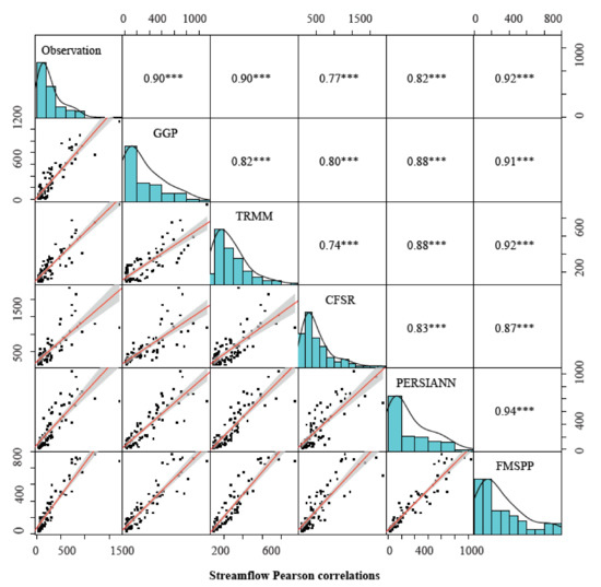 The probability density distribution of the measured streamflow and that of the streamflow simulated from different precipitation products. Their correlations and confidence intervals are also presented. (‘***’ indicates the significance level).