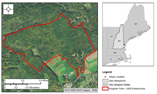 In order to adhere to Part 107 of the U.S. Federal Aviation Administration Regulations (Small Unmanned Aircraft Systems, 14 C.F.R. Part 107) and to maintain the safety of the research team and others, only a portion of the Kingman Farm was covered by the UAS, as indicated in Figure 1. The far eastern half of the property is classified as Class E to Surface airspace belonging to the Pease International Airport and is off limits to UASs; it was thus removed from the study area. Additional limits were placed on the UAS mission area to ensure the pilot and visual observers could maintain visual line-of-sight as well as a constant radio connection with the UAS while flying.
