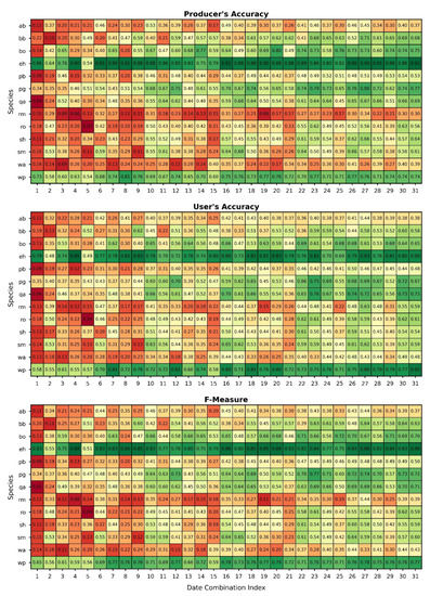 Due to the randomization approach implemented by the RF classifier, the accuracy of no two RF models will be the same. To account for this, 30 RF models were generated for each date combination in Table 4. Each model was validated and the OA, UA, PA, and F calculated. These results were then averaged together to calculate a mean accuracy result for each combination.