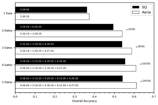 Figure 2 presents the results of the three best performing classifications for the single- and multi-date image stacks based on the OA. The OA for all the classifications performed can be found in Appendix A (Table A1 and Table A2). Overall classification accuracies were highly varied, ranging from 24.8% to 61.1% for the Aeria and 27.0% to 55.5% for the Sequoia. Across the individual date groups, the mono-temporal classifications had the lowest overall accuracies, reaching a maximum OA of 37.3% and 36.2% for the Aeria and Sequoia respectively. Generally, the inclusion of additional dates resulted in the accuracy of all classifications improving. However, there was a distinct leveling off in the OA as the number of dates included in the multi-temporal classification increased, reaching the peak OA for the five-date classification (Aeria) and for the four-date classification (Sequoia).