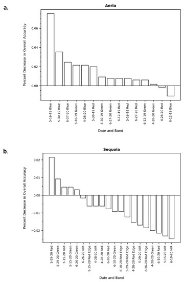 Feature importance values for the (a) Aeria and (b) Sequoia sensors. Feature importance was measured as the decrease in overall accuracy of the baseline model when that band was removed from the model. Positive values indicate a decrease in accuracy while negative values indicate an increase is accuracy.