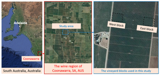 The test sites for this study are located in rural South Australia in the Coonawarra region (see Figure 1). Coonawarra is known for its premium quality red grape/wine attributed to the porous terrarossa soil, which generates moderate water stress [46,47]. The Cabernet Sauvignon vineyard at the Wynns Coonawarra Estate (37°17′8.5″S 140°49′37.9″E) at Coonawarra, which was planted over 17.3 in 1988, was used in this study. Two experimental blocks (each sized approximately 1 ) were delineated at the two ends of the 700 long row of the vineyard, which was planted in the east–west orientation. The grapevines had a bilateral cordon with a sprawling training system typical for the area. Conventional vineyard floor, canopy management and integrated pest management practices were conducted in this vineyard.