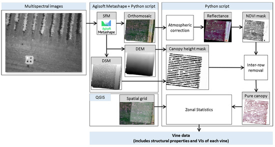 The workflow developed to process the UAV-based images and extract the canopy-specific structural information and spectral indices.