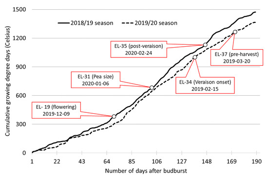 The cumulative growing degree days for the Cabernet Sauvignon at the Wynns Coonawarra Estate, Coonawarra for the two seasons, 2018/19 and 2019/20. The data acquisition stages for both seasons are shown.