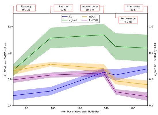The evolution of kc, along with the most significant spectral/structural features, are presented in Figure 6. The displayed features had the highest significance and correlation coefficient with kc. The seasonal kc values followed the pattern, which was noted physically and observed in the canopy LAI measurements, of rapid canopy growth until the véraison and stability after that. The kc started at a mean value of 0.48 at the start of the season and steadily increased to a mean value of 0.67 by the end of the season. The trends of NDVI and ENDVI2 appear to be less sensitive to canopy growth, while the c_area was the most sensitive, particularly in the early season between fruit set and pea-sized berries. Between the pea size and véraison, all of the remote sensing temporal trends do not appear to reflect the kc trend. Post véraison, all the indices show a strong agreement with each other and reflect little to no changes in canopy development/growth. The decrease in spectral indices post véraison may be reflecting the depletion of nitrogen in the vine, including the leaves [74,75]. The seasonal evolution graph suggests that either the c_area alone or a combination of c_area and spectral features could be the best predictors of kc at any timepoint. The best performing model for each timepoint could incorporate the timepoint specific data. However, this study assesses a holistic model to reduce the timepoint specific bias due to the small sample size, as well as to provide a robust predictor that is not limited by the growth stage of the plant.