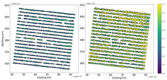 The UAV flight planning and multispectral image acquisition protocol were fixed for the entire two seasons of the field campaign. The UAV was flown at a height of 30 above the ground at a speed of 3 and in a regular mapping pattern flight, while the camera captured a multispectral image (5 band discrete images) every second. The flight parameter and camera setting together resulted in over 80% forward and side overlap, which is necessary for SfM processing [49,50].
