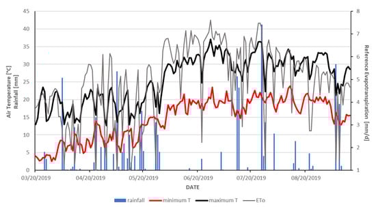 Daily maximum (black line), minimum (red line) air temperature, reference DSSAT evapotranspiration (gray line), and rainfall (blue vertical bars) during the 2019 growing season from the Agenzia Regionale per la Prevenzione e Protezione Ambientale del Veneto (ARPAV; http://www.arpa.veneto.it/, accessed on 1 July 2021) weather station in Rovigo.