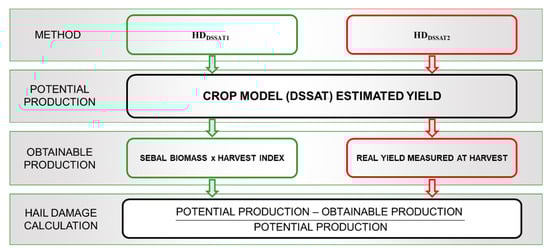 Moreover, the HDDSSAT1 calculation approach was extended to the literature HI values. These methods are labeled as HDDSSAT1_0.4, HDDSSAT1_0.45, and HDDSSAT1_0.5. All the methodologies were compared to the HDinsurance to estimate differences between the methods. Hail damage was calculated from the DSSAT-estimated potential yields as in Figure 3.