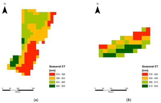 SEBAL seasonal ET maps generated for Field 1 (a) and Field 5 (b).