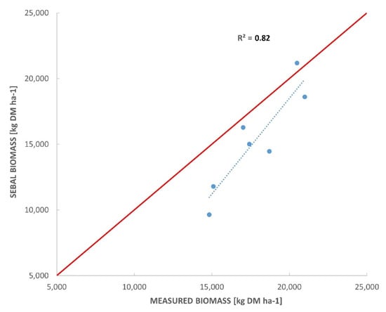 Comparison between measured aboveground biomass from hand-harvested plant samples (x axis) and SEBAL-estimated aboveground biomass (y axis) for all the different experimental areas. Values are expressed as kg DM ha−1. The 1:1 line is reported in red.