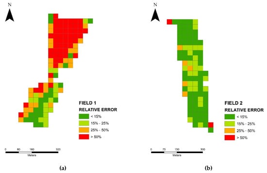 Relative error maps generated for Field 1 (a) and Field 2 (b) between measured and SEBAL-estimated yields.