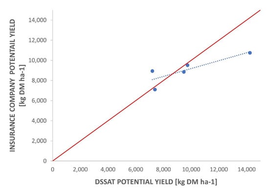 DSSAT-estimated potential yield (x axis) and potential yield estimates from the insurance agents (y axis) for the five damaged fields. Values are expressed as kg DM ha−1. The 1:1 line is reported in red.