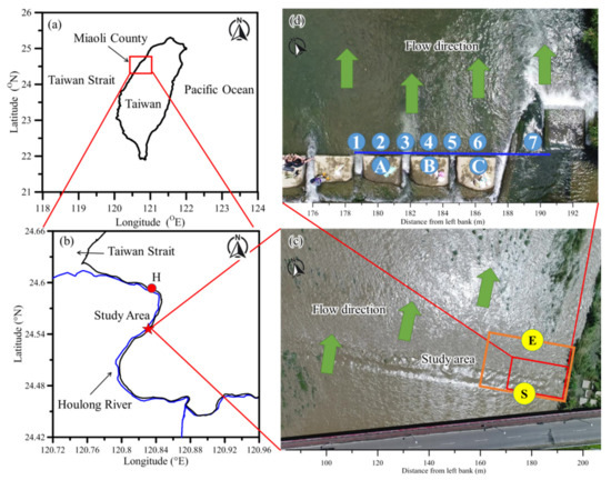 Map showing (a) the location of Miaoli County in Taiwan, (b) the study area located along the Houlong River, where the symbol H represents discharge station, and (c) the groundsill works flooded during high flow period. The symbols S and E denote the start point and end point using the float method, respectively, and (d) the groundsill works exposed during the low flow period. The measurement locations from number 1 to number 7 using a flow meter and the artificial tracers (i.e., wood shavings) released at locations A, B, and C are illustrated in the figure.