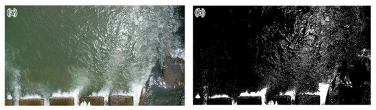 In image preprocessing, the main step is to enhance the characteristics of the tracer in the images. The original image and the enhanced image are shown in Figure 3. There are more ripples on the right side of Figure 3b so, after preprocessing the image, the captured river surface ripples appear to be white, and the area on the right side of the image, where the flow velocity is faster, has more ripples. On the left side of the image, the flow velocity is slow, and the ripples on the river surface are not obvious, so the area on the left is black.
