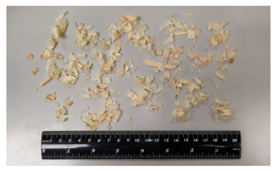 The first experiment was conducted on 31 May 2019, under low flow conditions. The content of this experiment includes aerial photographs of UAVs at take-off heights of 9 m, 12 m, and 15 m, terrestrial fixed photographs, and flow meter measurements. In addition, different numbers of artificial particles (i.e., wood shavings) were soaked in water before introducing them into the flow at the same time to change the density of artificial particles flowing on the water surface using 1.5 kg per minute, 3.0 kg per minute, and 4.5 kg per minute. Figure 4 shows the shape and dimension of wood shavings used in the experiments. The area of wood shavings ranges from approximately 0.25 to 6 cm2.