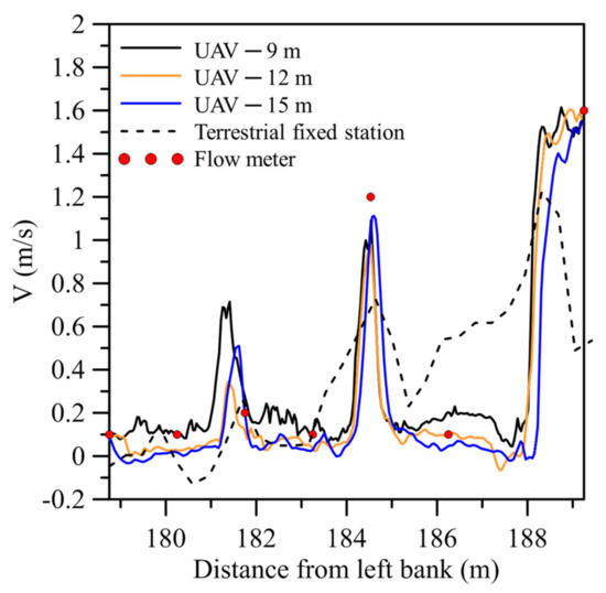 Figure 5 depicts the flow field generated by PIVlab from UAV flight heights of 9 m, 12 m, and 15 m. High velocity flow occurred between the groundsill works. In the figure, the distance from the left bank is taken as the x-axis, and the y direction is parallel to the river flow and represented as V (m/s). The surface flows of each checkpoint measured using a flow meter are presented on the x-axis and compared with the measured results using LSPIV taken at different UAV shooting heights, and the terrestrial fixed photography results are shown in Figure 6. In this figure, UAV_9 m, UAV_12 m, and UAV_15 m denote the LSIPV records taken from UAV flight heights of 9 m, 12 m, and 15 m, respectively. LSPIV expresses the LSPIV results from terrestrial fixed stations at a height of 12 m. This indicates that UAV-based LSPIV captures the surface velocity of benchmark measurements using a flow meter at locations 5 and 7 (see Figure 1d), which exhibit higher velocities.