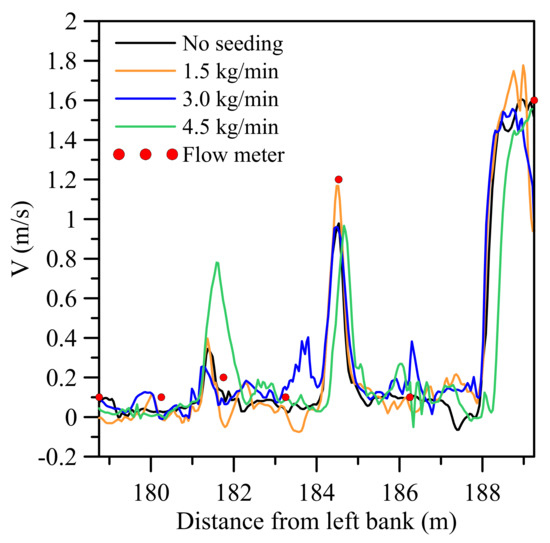 Figure 7 presents the flow fields generated by PIVlab using a UAV flight height of 12 m with different seeding artificial particle densities. The artificial particles (i.e., wood shavings) are highlighted with red square marks during the low flow period. Figure 8 illustrates the measured results of surface velocity using LSPIV from a UAV flight height of 12 m without seeding particles and with different seeding densities. Table 3 indicates the statistical errors with different artificial seeding particle densities and without artificial particles. The MAE values using UAV aerial photography at a flight height of 12 m without seeding particles and with artificial seeding particles of 1.5, 3, and 4.5 kg/min were 0.07, 0.11, 0.11, and 0.12 m/s, respectively. The results indicated that even increasing the density of artificial particles did not significantly enhance the measurement accuracy.