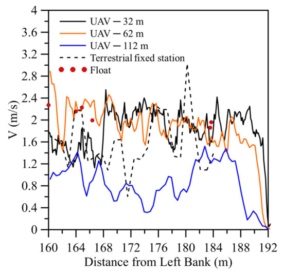 The flow fields generated by PIVlab from UAV flight heights of 32 m, 62 m, and 112 m, and from terrestrial fixed stations at 12 m height are illustrated in Figure 9. This result showed that, due to the high flow conditions occurring on the day of measurement, the groundsill works were submerged by river water. The measured surface velocity was in the range of 2.065 ± 0.205 m/s. To compare the measurement results using LSPIV at different UAV flight heights and with a terrestrial fixed imaging system, the surface velocity data measured with the float method were regarded as the observation data. Figure 10 compares the measurement results using LSPIV from different UAV flight heights with terrestrial fixed stations and the results using the float method under high flow conditions. In this figure, UAV_32 m, UAV_62 m, and UAV_112 m represent LSPIV analysis completed at UAV flight heights of 32 m, 62 m, and 112 m, respectively. LSPIV denotes the LSPIV results taken by terrestrial fixed stations at a height of 12 m. Table 4 shows the statistical errors of using LSPIV from different UAV shooting heights and terrestrial fixed stations at a height of 12 m. Among them, the UAV aerial shot collected at a height of 62 m using LSPIV for measuring the surface velocity yielded the best result, and the mean absolute error was 0.27 m/s. The mean absolute errors between the terrestrial fixed photography station and UAV flight heights of 32 m and 112 m were 0.46 m/s, 0.49 m/s, and 0.97 m/s, respectively. It should be noted that the UAV flight height of 112 m yielded the worst measurement result. This was the reason that the UAV flight height was high, resulting in a low resolution, making PIVlab misjudge the extent of particle displacement [16,57]. For example, Tauro et al. [57] reported that the image field of view did not exceed 30 × 30 m, and the flight height of the UAV was approximately 30 m.