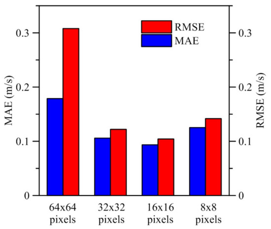 Figure 11 displays the statistical errors of using LSPIV derived from the UAV under different IAs. Because the measurement error of LSPIV with an IA scale of 8 × 8 pixels was greater than that of the IA scale of 16 × 16 pixels, the measurement error did not decrease as the IA scale decreased. The reason was that, when the IA scale was smaller than 16 × 16 pixels, the search range was too small and the number of search features also decreased, which increased the error of image matching, resulting in an increase in the measurement error. The most appropriate IA scale for LSPIV derived from UAVs to analyze the surface velocity was 16 × 16 pixels. Yeh et al. [7] reported that the IA window size should be designed to be greater than four times the particle displacement in PIV, but is more restrictive for LSPIV.