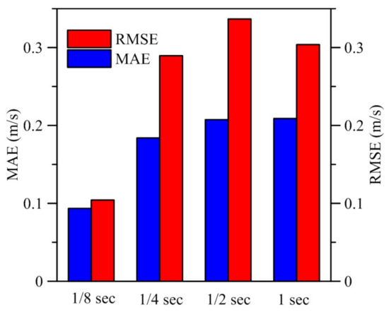 Figure 12 depicts the statistical errors of using LSPIV derived from UAVs under different image acquisition time intervals. When the image acquisition time interval increased, the statistical errors of the MAE and RMSE values increased. This was attributed to the fact that the tracers might leave an interrogation area between images. This resulted in high statistical errors in the measured surface velocity. Similar results were also demonstrated by Meselhe et al. [65] and Dobson et al. [4].