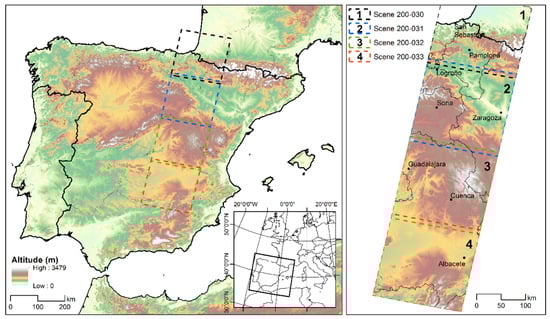 The study area is located in the Iberian Peninsula (Figure 1) and is defined by the Landsat scenes with path 200 and rows 030 to 033 of the Landsat Worldwide Reference System-2 (WRS-2), located between −4°0′W and 0°1′E and 38°0′N and 44°6′N and covering about 126,000 km2. The area comprises large part of the Spanish Autonomous Communities (NUTS 2) of Andalucía, Aragón, Castilla-La Mancha, Castilla y León, Euskadi, Navarra, La Rioja, some part of Madrid, Comunitat Valenciana and Murcia, and part of the French Pyrénées-Atlantiques department located in the southwest of France and the Nouvelle-Aquitaine region. The scenes cover a large sector of the Ebro hydrographic basin and the head of the Tagus, Jucar, Guadiana and Guadalquivir hydrographic systems.