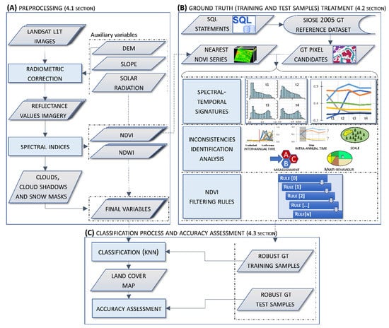 Methodology flowchart. Image pre-processing (A) provided the final variables used in the classification process and NDVI series to characterise the spectral-temporal signatures of the different classes. (B) Structured Query Language (SQL) statements applied to SIOSE 2005 rDS provided a set of polygon selectors which determined the initial GT candidate pixels. (C) The rules applied to GT candidate pixels provided a final set of robust GT samples, segregated into training and test area (TTA) subsets.