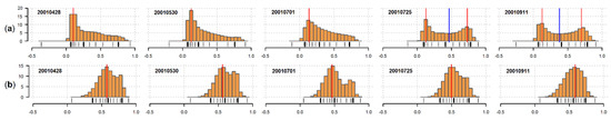 The temporal relative frequency distribution of the NDVI is displayed for (a) irrigated herbaceous crops and (b) broadleaf evergreen forest categories. Percentage values are shown in the vertical axis, while the NDVI range of values is presented in the horizontal axis. The red and blue vertical lines define modes (Mo) and antimodes (AMo), respectively; modelled locations are useful when multimodality is assessed [96]. Dates are in year-month-day format.
