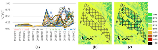 Figure 4. The NDVI summer multiannual profile of irrigated herbaceous crops is shown. Colour lines in (a) represent the median value of the pixels within polygon tiles. For the sake of simplicity, a random third of the tiles are represented. The red, grey, green and blue dotted lines over date figures denote the imagery (summer months), including 20 July 2005, as a date that is contemporary to the rDS. In (b,c), the polygon is represented in black over two summer dates NDVI (25 July 2001, and 20 July 2005). Note that during the first time period, the pattern is highly stable. - (b)