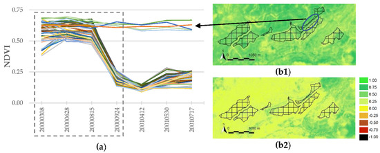 Figure 5. Intra-annual NDVI temporal profile over a coniferous plantation area. Colour lines in (a) represent the median values of the pixels in tile polygons displayed in (b1,b2), and the grey dotted rectangle denotes the intra-annual imagery dates. In (b1,b2), tile polygons are represented with black outlines over 15 August 2000, and 24 September 2000, NDVI. - (c)