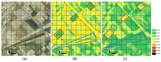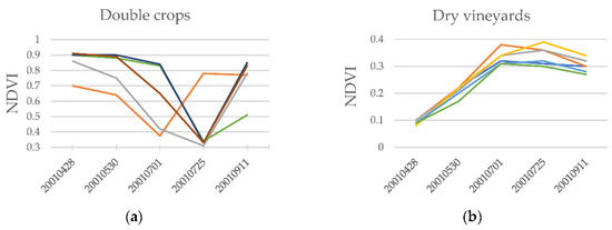 - Multiple (phenological) behaviours are mainly associated with agriculture categories. Crop phenology is complex, and there is a large chance that two neighbouring crop fields within a polygon can be in very different phenological stages (active crops, fallow patterns), as well as belong to different categories (winter crops, summer crops or woody crops). Examples of multiple behaviours were detected in dry and irrigated herbaceous crop polygons. The latter is exemplified in Figure 8. Only part of the entire polygon is displayed due to the large area occupied by the irrigated crops in this area. In (a), the orthophotography depicts the spatial variability, different sizes and phenological states of crop fields. In (b), 28 April 2001, NDVI denotes active winter (red rectangles), perennial crops and other inactive fields. In contrast, on 25 July 2001, NDVI denotes that (c) active summer crops (blue triangle) and inactive fields dominate the area. The contrasting phenological behaviours in large irrigated crop polygons become a source of error and confusion between winter/summer crop categories.