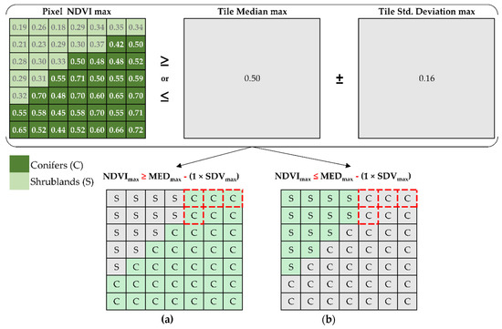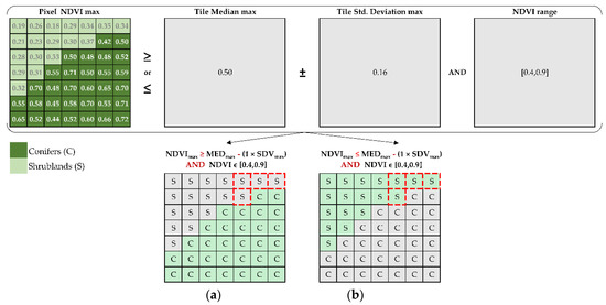 For instance, we focus on a composite land cover polygon tile (e.g., A(65CNF_35MTR)), defined as an association of 65% coniferous and 35% shrubland in Figure 9. In this tile, coniferous pixels can be discriminated by selecting pixels with an (NDVImax ≥ MEDmax − (1 × SDVmax)). Complementarily, pixels with an (NDVImax ≤ MEDmax − (1 × SDVmax)) characterised low NDVI values associated with shrublands. In both statements, transitional values (red squares) would be incorrectly managed if they were not filtered out.