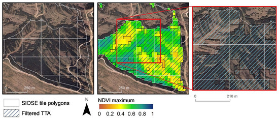 Rule 1 is applied over a composite land cover polygon defined as an association of 70% coniferous and 30% shrubland depicted in Figure 10. The rule statement is defined as (NDVImax ≥ MEDmax − (1 × SDVmax)) to select the more densely forested areas. The orthophotography allows us to differentiate compact and densely forested plots from sparsely vegetated areas. Tile polygons are depicted with white outlines. The highest NDVI maximum values are shown from green to blue, whereas the values under ~0.40 are associated with scarce vegetation. The zoom details pixel exclusion in these areas. It is worth noting that for the tiles where lower NDVI maximum values predominate (e.g., tiles mixing coniferous and shrubland or those affected by a forest fire), it is essential to consider a complementary condition statement to exclude lower NDVI responses, the minimum NDVI threshold detailed in Rule 2.