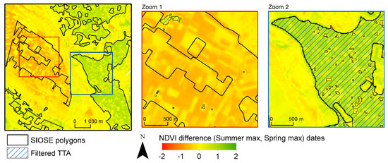 This rule complements Rule 1 but can also be used independently. Since the series of NDVImax is assumed as a reference value, a minimum NDVI threshold is necessary. The aim is to isolate positions that do not fit the category NDVI characteristic range in the initial set of GT candidate pixels, especially in composite land cover polygons. Moreover, intra-annual disturbance events (forestry clear-cuttings or fire events) in forested areas cause NDVI drops, for which pixels can also be isolated. Rule 2 used independently can be helpful to extract crop categories characterised with a specific NDVI range of values (e.g., rice crops NDVI range approximately between [−0.30,0.80]).