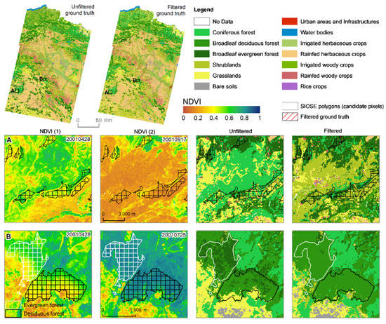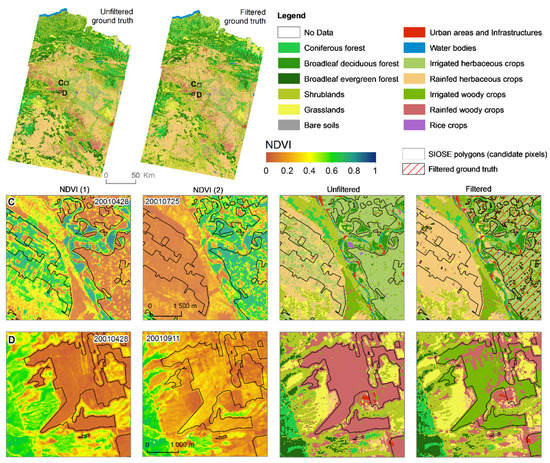 Finally, rDS usually define the temporal reference of the product. For instance, during the first version of the SIOSE project, high-resolution 2005 SPOT-5 images (at a 10 × 10 m2 resolution), together with auxiliary data were produced from photointerpretation tasks. Ideally, the cartographic production is updated periodically, providing a temporal pseudo-continuity. Depending on the availability of an rDS that is temporally close to the imagery to be used for classification purposes, there will be time differences to a lesser or greater extent. The lack of temporal consistency between images and rDS can lead to phenological inconsistencies between the real spectral signatures and the rDS associated labelling. A previous study detected thematic inconsistencies and errors during the classification process when reliable GT samples were derived, both at the training and validation stages, considering older images with respect to a rDS (namely a backdating effect) [54]. This work proposed a strategy consisting of finding spectrally invariant pixels for the legend categories between the rDS date and the imagery date. The same strategy can be used when images in the future are used with respect to a former rDS date (being an updating effect in this case).
